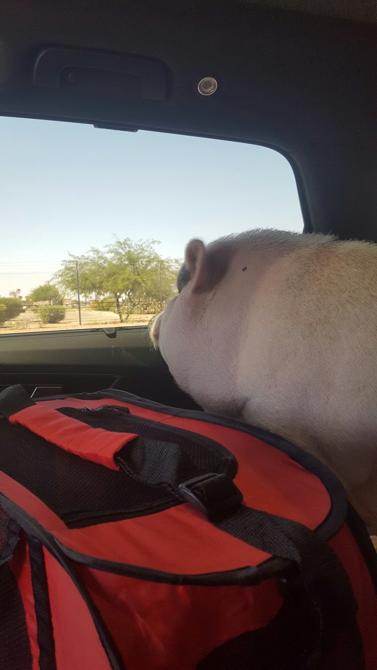 We finally got into our hotel room around 2am… trying to keep a pig quiet and get him into an elevator requires a lot of patience. Thankful Tank wasn’t as bad as I thought he’d be. I was very thankful the hotel let us take my 130 pound pig in. But we had to sneak Teddy in.. so he hid in my mom’s bag.. thank God he’s quiet. Pigs eye-sight isn’t very well so when the floor changed color from the carpet to the wood he kind of panicked and stayed on the carpet… it took a huge bag of cat food to get him into the elevator.